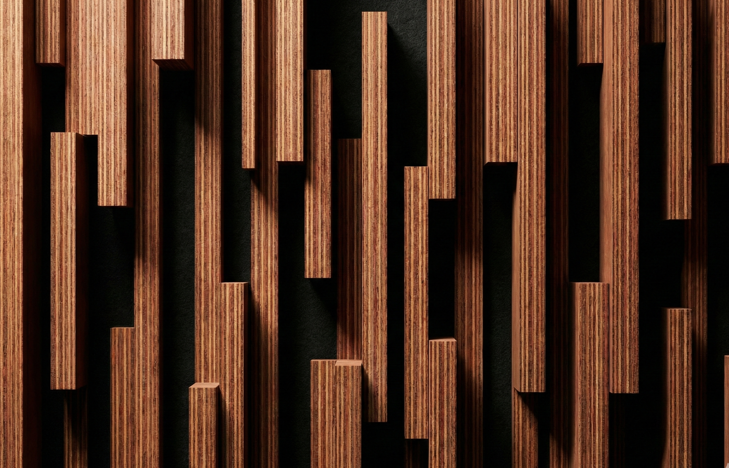荒々しいアピトン材のブロックが積み上げられていますが、その間には「深い黒のスリット(隙間)」があります。