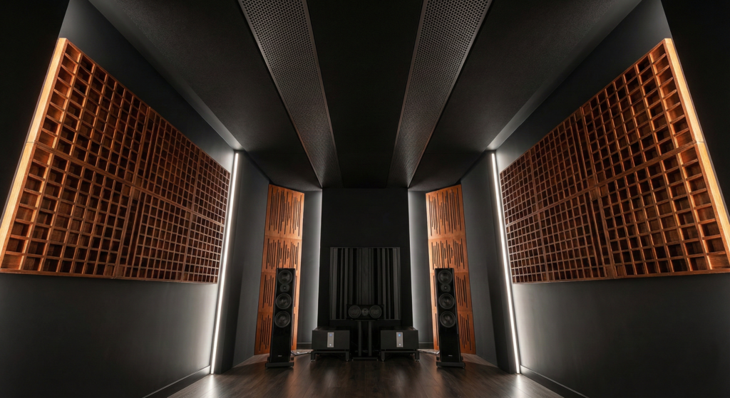 壁面に配置されるランダムな格子状のディフューザー。 これは単なる模様ではありません。QRD(Quadratic Residue Diffuser)などの整数論に基づき、深さと幅を不規則に変化させた「計算された凹凸」です。