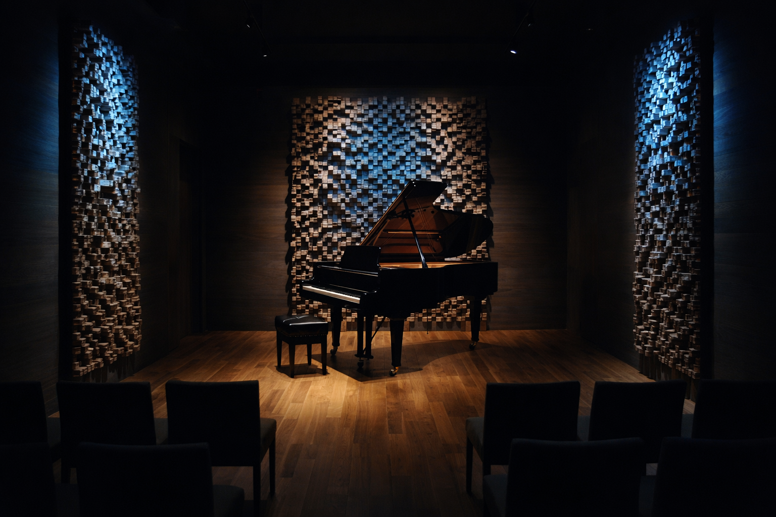 吸音、拡散、配置、時間構造を含めて空間を整理しています。