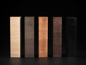 荒々しいアピトン材のブロックが積み上げられていますが、その間には「深い黒のスリット(隙間)」があります。
